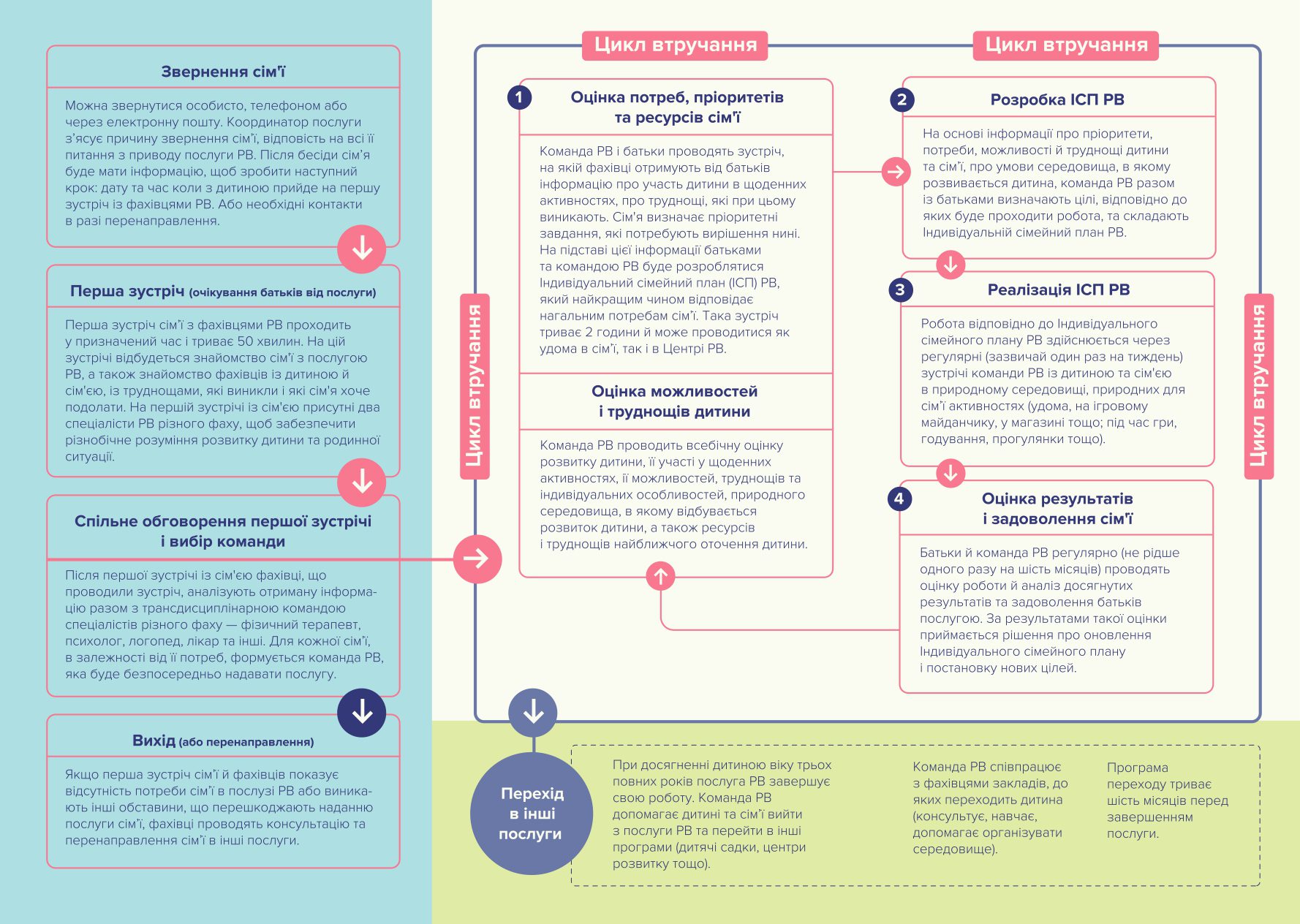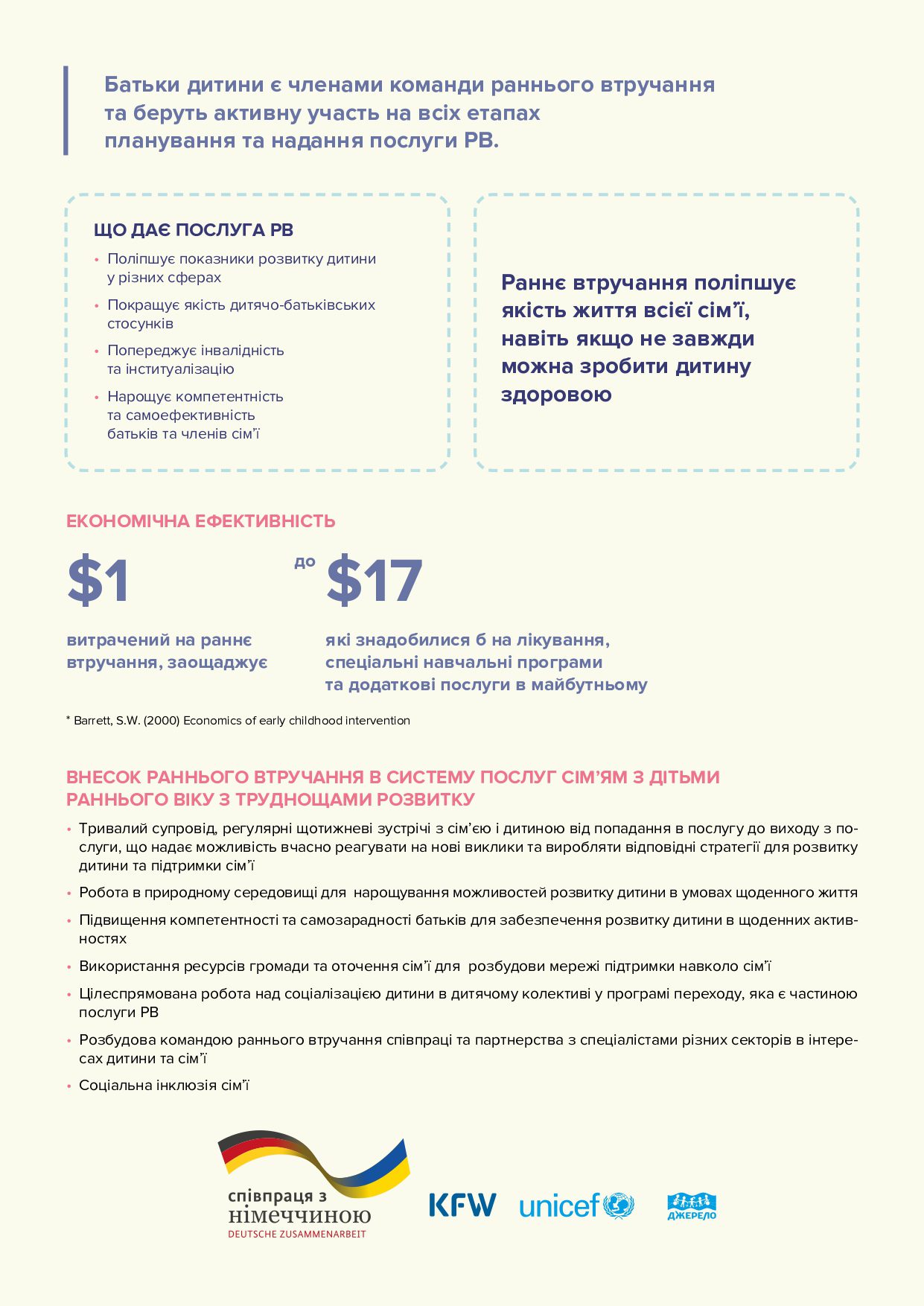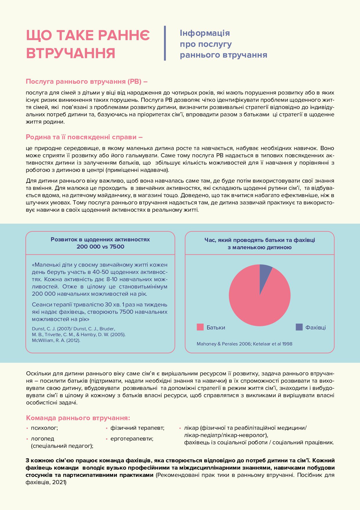 Послуга раннього втручання – це послуга для сімей з дітьми у віці від народження до чотирьох років, які мають порушення розвитку або в яких існує ризик виникнення таких порушень. Послуга раннього втручання дозволяє чітко